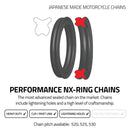 Ultra strong, the ZVX3 series chains easily surpasses every other brand with a tensile strength of 11,100 lbs. An all new design, the new NX-Ring lasts 15% longer than the ZVX series, improved stiffness and weight and also minimised the clearance between the plates.